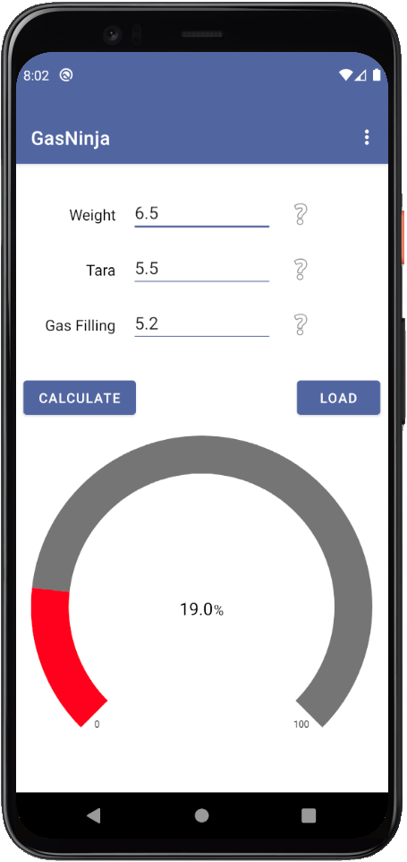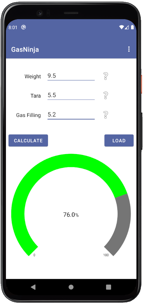 Simply enter the 3 values Weight, Tara and Gasfill and click "Calculate". The result will be caculated and shown in the graph.